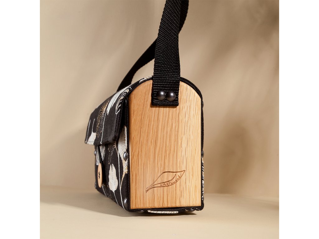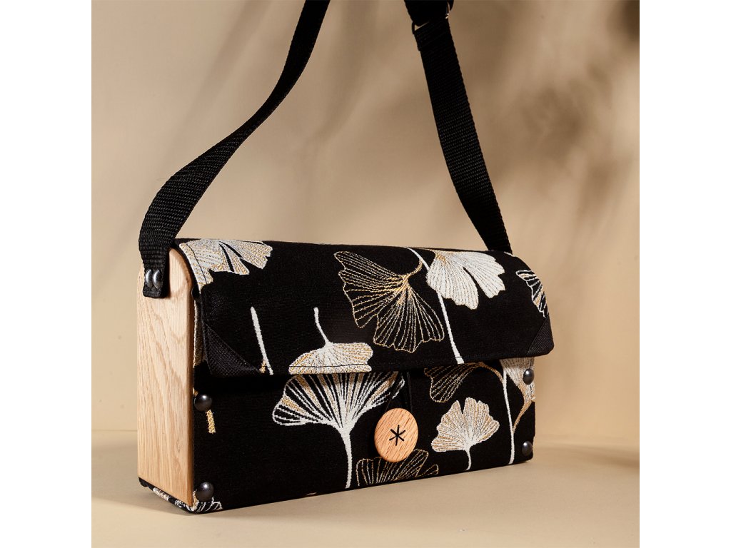 A táska oldala gondosan megmunkált szépséges tölgyfa Biopin keményolajjal kezelve, anyaga kívül fekete alapon ginkgo-mintás jacquard, belül vízlepergető, de nem vízálló gyöngyvászon. Magassága kb. 12,5 cm, mélysége kb 7cm, szélessége kb. 22 cm, tehát egy méretesebb mobil is belefér. Belül egy zsákocska jellegű zseb osztja, hátsó oldalán külön cipzáras rekesszel pl. igazolványnak. Kb. 130 cm hosszú, hevederből készült pántját ugyanolyan antik színű kárpitos díszszegek tartják, mint ami a táska textilrészét rögzíti a fához. Gombja szintén saját készítésű, tölgy anyagú, a fekete cérnás felvarrás csillag alakot formáz.  A táskához bőrvarró cérnát használtunk, hogy ne akarjon elszakadni.