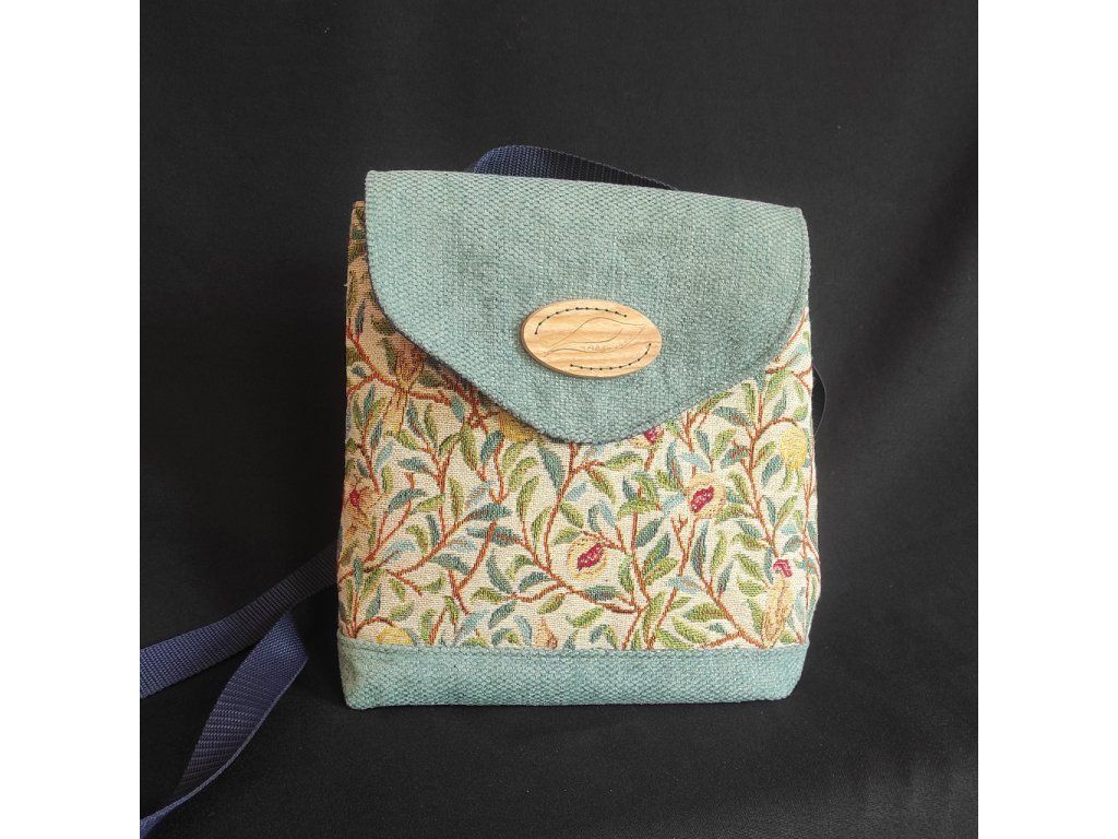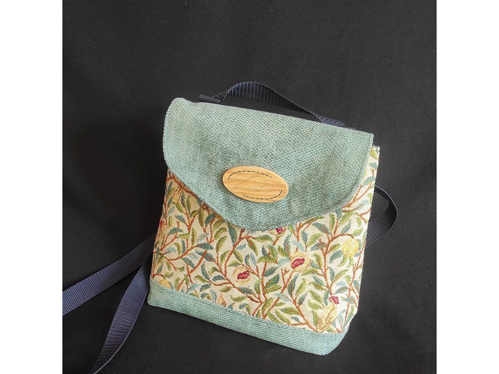 Hátizsákból oldaltáskává alakítható világos táska az angol Arts and Crafts mozgalom tervezőjének, William Morrisnak a mintájával